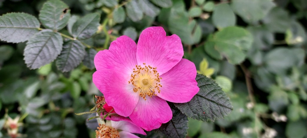 As I cross towards the river, overgrown brambly banks yield a small cluster of glorious pink blooms, dog rose I think, although sweet briar is apparently similar.