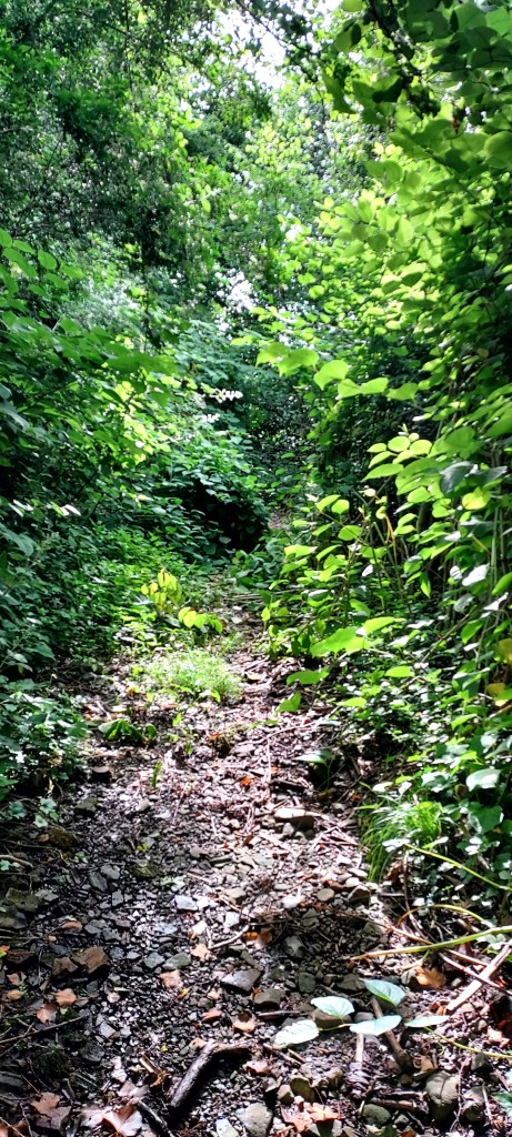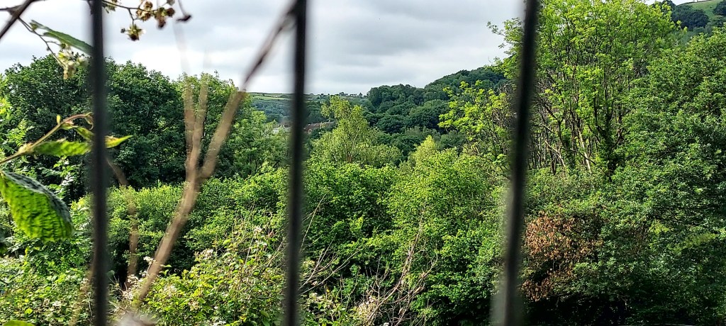 Within a few metres it becomes it becomes clear that there is zero maintenance of this pathway, and that it is seldom used, but I decide to push on a little further in hopes of discovering where it goes. I pass a thick section of large and intrusive vegetation which I fear may be Japanese knotweed, and nearly turn back after extricating my trousers from the 10th bramble, but then I turn a corner and find myself in a squashy section of path pressed against a wire fence on my right hand side, with far reaching views across the valley.