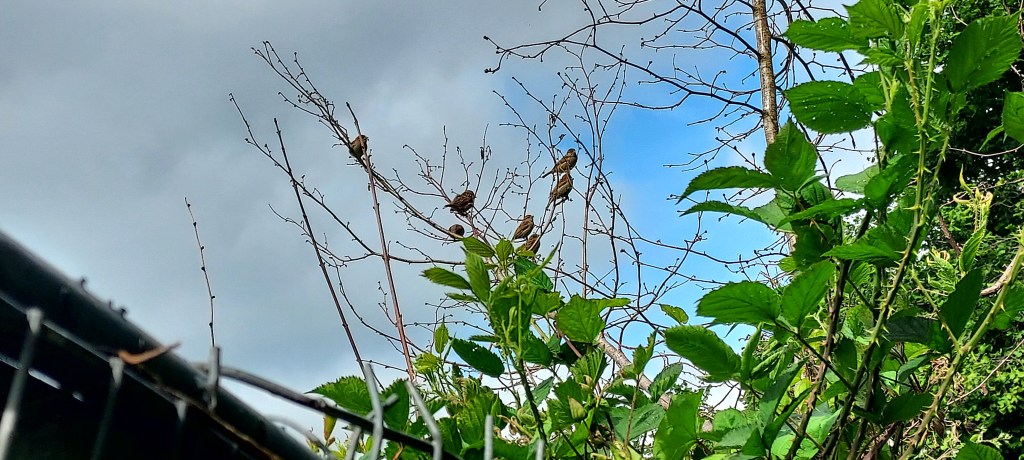I stop completely still and wait, as sparrow after sparrow flies back to the nearby trees in the stillness. A mixture of tree and house sparrows, there must be forty or fifty easily, spread over two or three surrounding trees, and some are close enough that I can watch their antics from branch to branch, seeing the insects and tiny caterpillars clutched in their beaks.