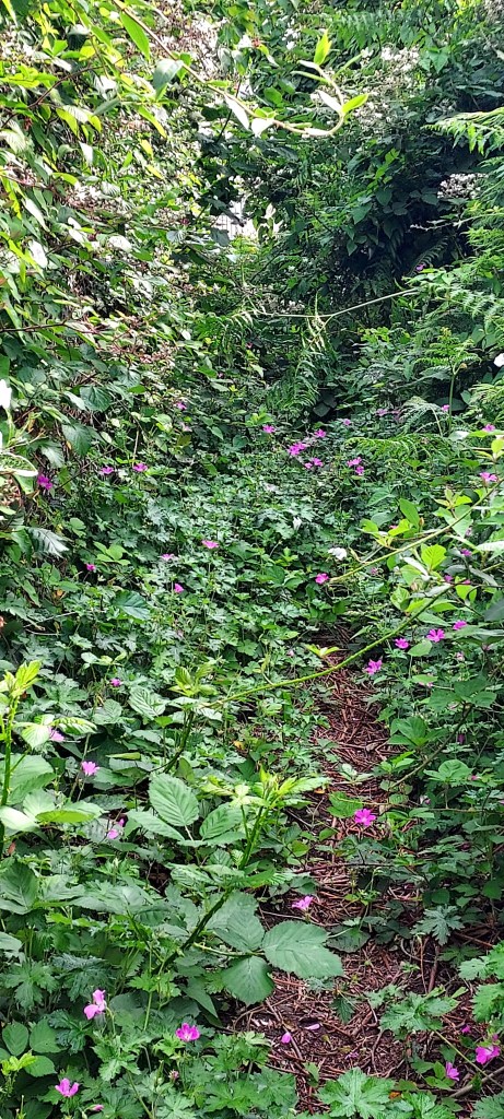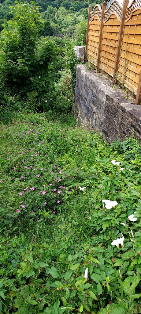 Thankfully, while no actual path is visible, the undergrowth in this section is more ferns, assorted wildflowers and bindweed than it is bramble, or I may have turned back. The last stretch leading up to the street is literally just three feet high solid undergrowth, and spotting two men having a chat up on the road ahead of me I feel faintly ridiculous, trying to appear casual whilst appearing from a solid wall of greenery between two houses. Looking back at the pathway, there is no apparent pathway on which to look back…