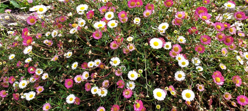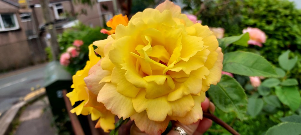 I pause to admire a common roadside staple, Fleabane, the exuberant and higgledy piggledy blooms of which always make me feel joyful, and instantly transport me to Cornwall, where I picture it adorning elderly stone walls in the idyllic Helford river valley. I soon have, if not my whole head this time, at least my nose, buried in another flower, a glorious yellow rose, bold and unapologetically heady in its wonderful summer scent.