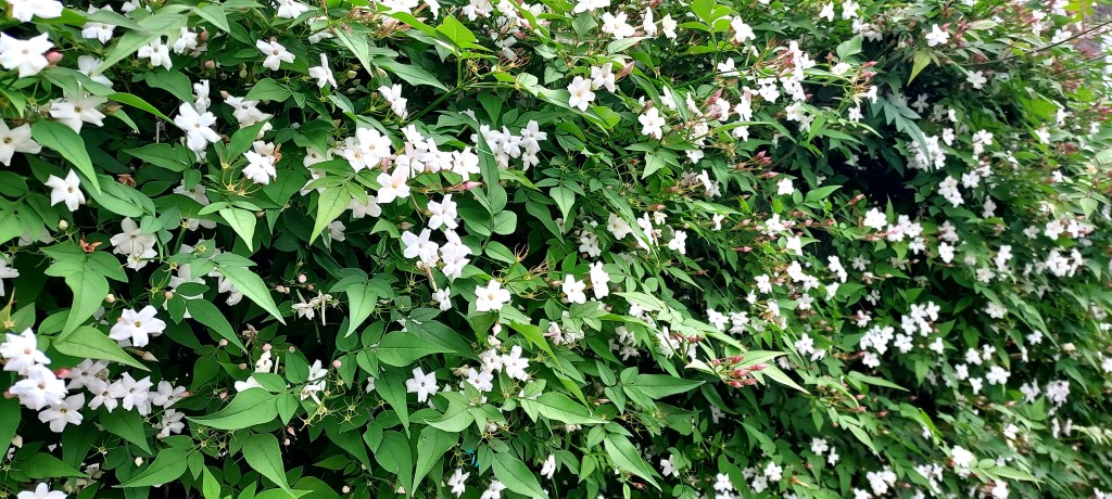 The jasmine creeps and climbs exuberantly over a raised front fence, full flowering, intense and euphorically scented, a stardust scattering of its abundant petals on the ground below. Inhaling one of the best smells in the world is worth a raised eyebrow as far as I’m concerned.