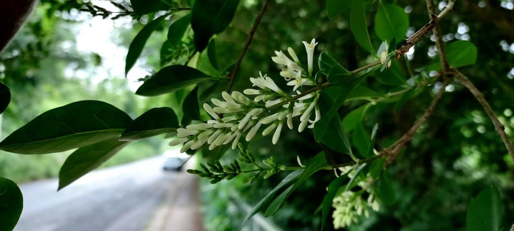 I stand on the edge of this woodland slope, breathing in the smell, then I notice beautiful white flowers in a tree. I don’t know or recognise them, I walk a bit further and the flowers continue, the smell continues. I put two and two together and stick my head in a flower – I have located the smell!