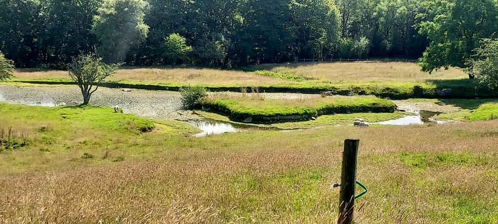 Ahead I can see a large pond or pool, with sheep clustered in shade under the trees.