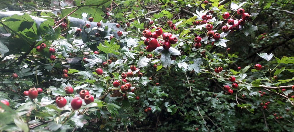 To me, nature is often at its most alluring in these in between, indeterminate time periods, its most mysterious and beguiling. I capture this peculiar quality of light in the next burst of colour relief on my walk, the dark flush of hawthorn berries.