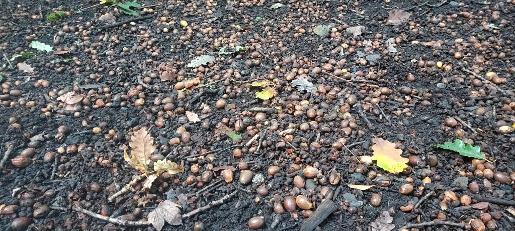 The acorn field stretches away for a good 20 metres in either direction from the towering oak from which they have presumably originated. It looks like someone has made elaborate preparations for Squirrelfest 2025.